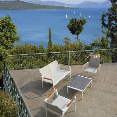 تجعل الخطوط النظيفة والمواد الأنيقة من هذه الأريكة الخارجية مكانًا بارزًا. مثالي للاسترخاء الأنيق من الفناء إلى جانب المسبح ، إنه مصنوع بشكل رائع من الألمنيوم والمنسوجات المتينة. مستوحى من المفروشات الحديثة في منتصف القرن ، يوازن التصميم متعدد المواد بين الهندسة الأنيقة والتفاصيل الجذابة.