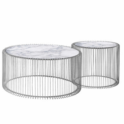 هذه المجموعة المكونة من 2 طاولة مستديرة ذات مظهر عصري بإطارها المعدني المسلح ، مصنوعة من الفولاذ المقاوم للصدأ وسطح من الرخام الطبيعي. يمكن اعتباره بالتأكيد قطعة بيان لمنزل أي شخص.