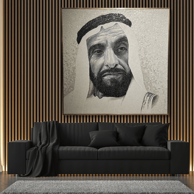 تتميز هذه الفسيفساء الرائعة المصنوعة يدويًا بحجم 120 × 120 سم بحجر اليشم الجليدي المميز لصاحب السمو الشيخ زايد، والمزين بإطار ذهبي. إضافة مذهلة لأي مساحة، تعرض هذه الفسيفساء الفخامة والرقي بكل التفاصيل. أضف لمسة من الأناقة إلى ديكورك بهذه القطعة الفريدة من نوعها.