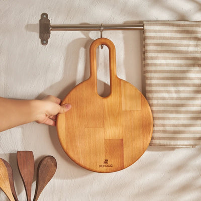 | المواصفات | لوح تقطيع دائري من كاراجا ايربان وود صغير حجم المنتج: 32x22.5 سم مادة المنتج: خشب |