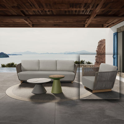 مع حبال، مع وسادة مقعد وظهر قاعدة من الألمنيوم بلون الساج، هيكل بلون تاوب PCTD20088، شريط عريض: PVC رمادي 576 بعرض 45مم وسادة المقعد والظهر: قماش SUNPROOF VOLGA C/163 + فوم عادي |