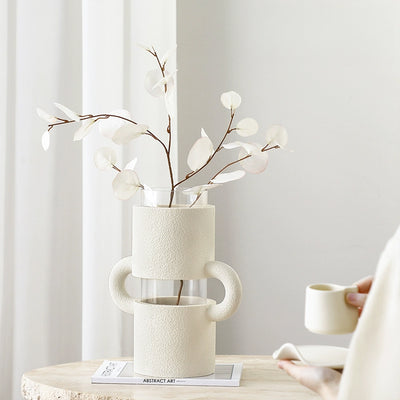 أضف لمسة من الأناقة إلى منزلك مع أمفورا من الريزين الأبيض والزجاج. مصنوعة من مواد عالية الجودة، تضيف هذه الأمفورا مظهرًا أنيقًا ومتقنًا لأي غرفة. مثالية لعرض الزهور أو كقطعة تزيينية مستقلة، إنها ضرورة لأي ديكور منزلي عصري. (الزهور غير مشمولة.)