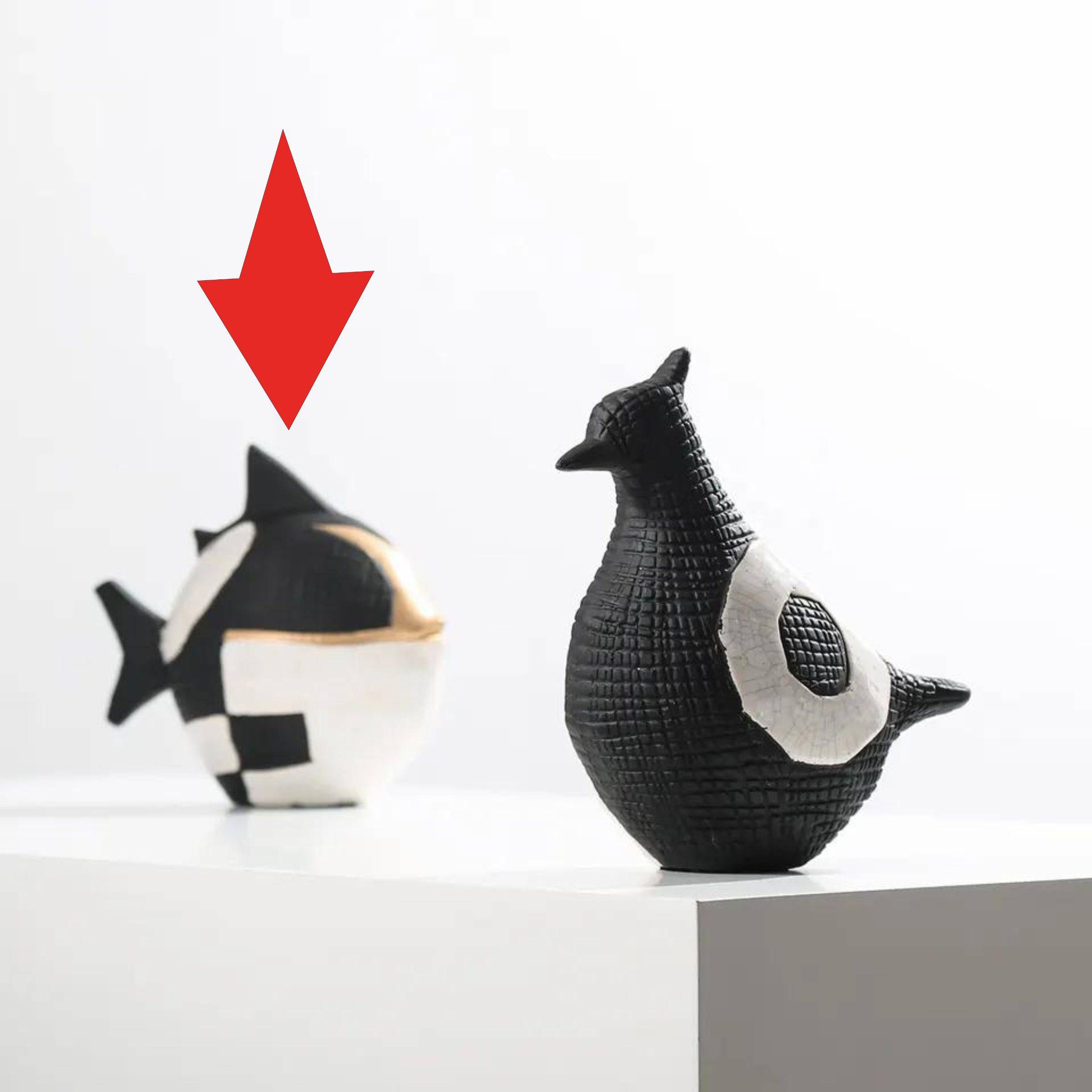 This stunning ceramic puffer fish is painted in shades of black, white, and gold for a beautiful effect. Its intricate detailing makes for a perfect decorative accent and a one-of-a-kind addition to any home. Handcrafted from ceramic, this fish will last for years with proper care.