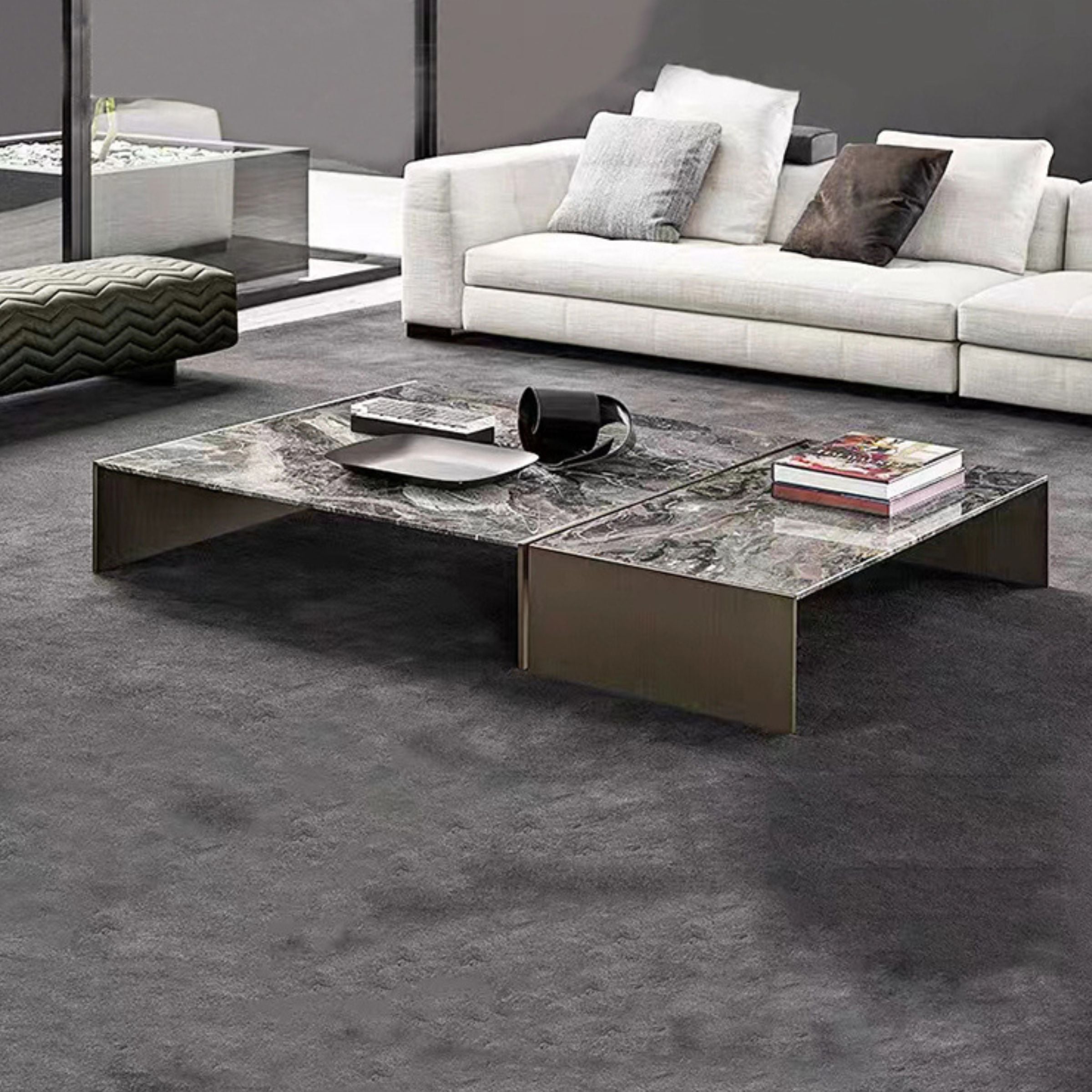 Elevate your living space with our elegant Set of 2 chrome bronze stainless steel and natural marble Coffee tables. Enjoy a touch of luxury with the sleek chrome and bronze finish, plus the durability of stainless steel and timeless beauty of natural marble. Elevate your coffee breaks.