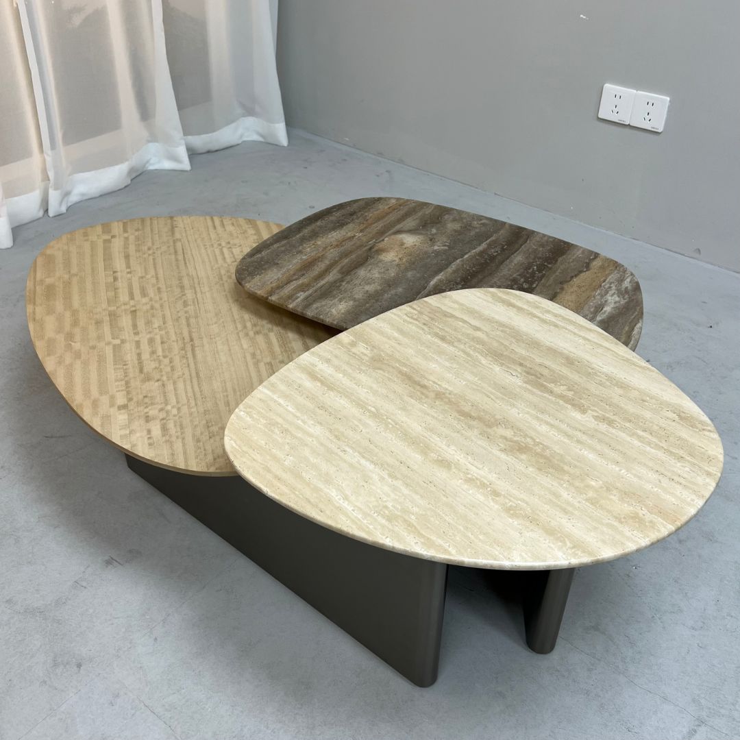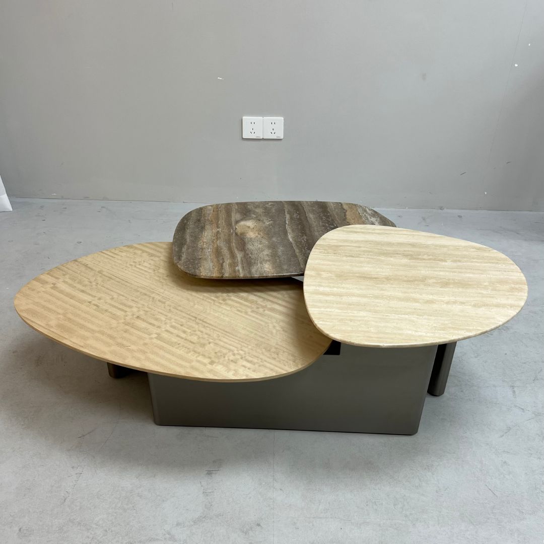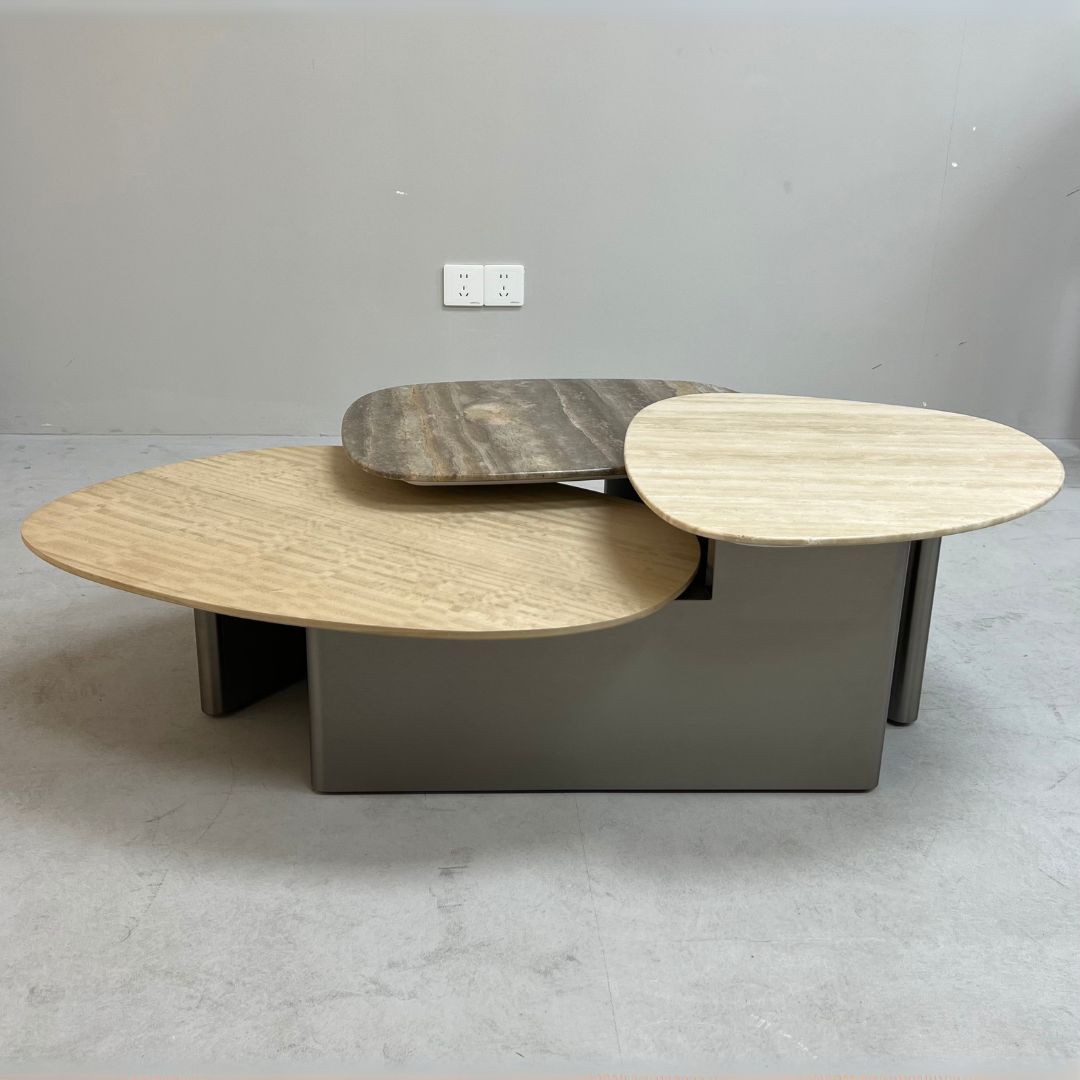 | Materials | stainless steel + veneer + travertine top METAL COLOR: black gun TOP COLOR: "lowest: beige veneer middle: brown travertine Highest: beige travertine" |