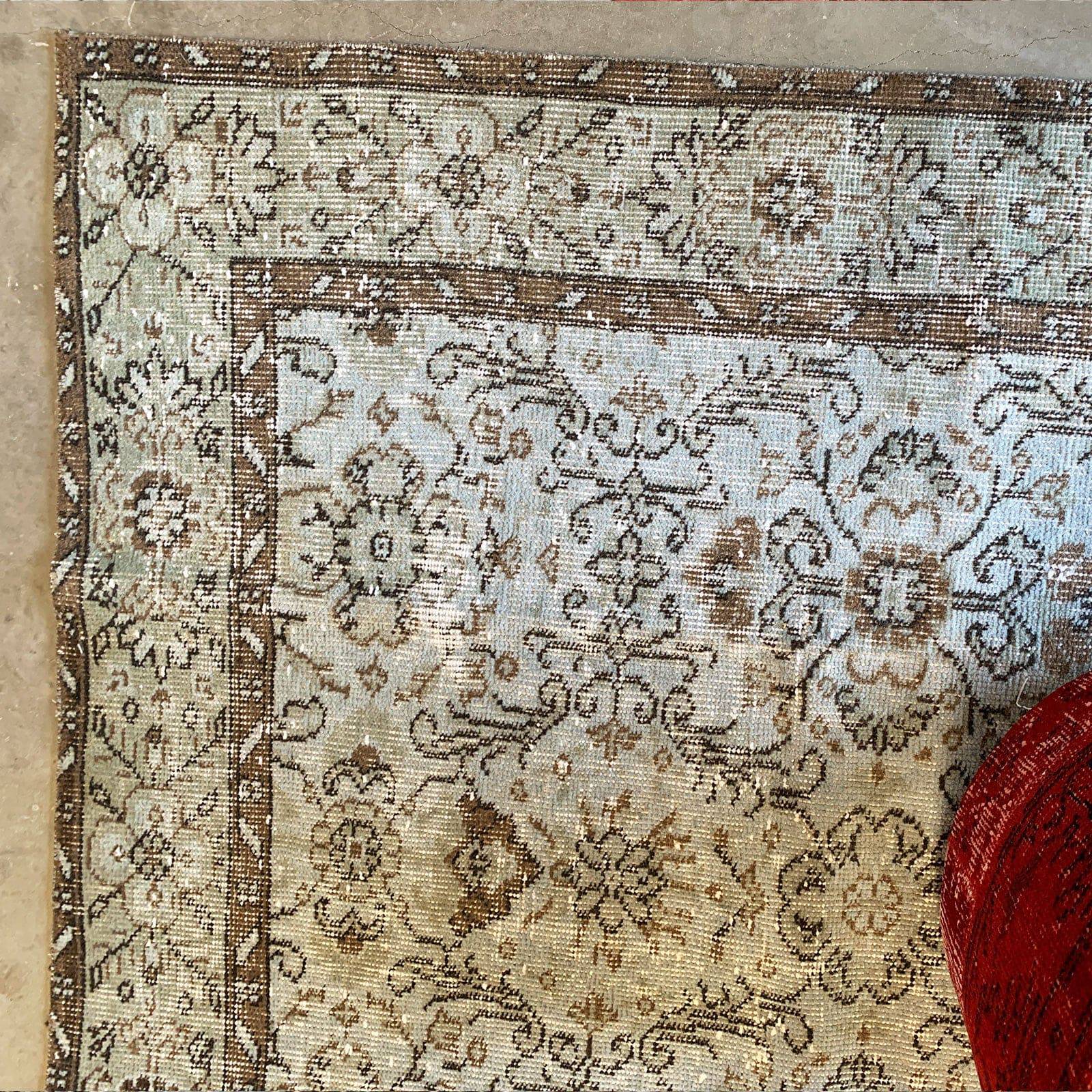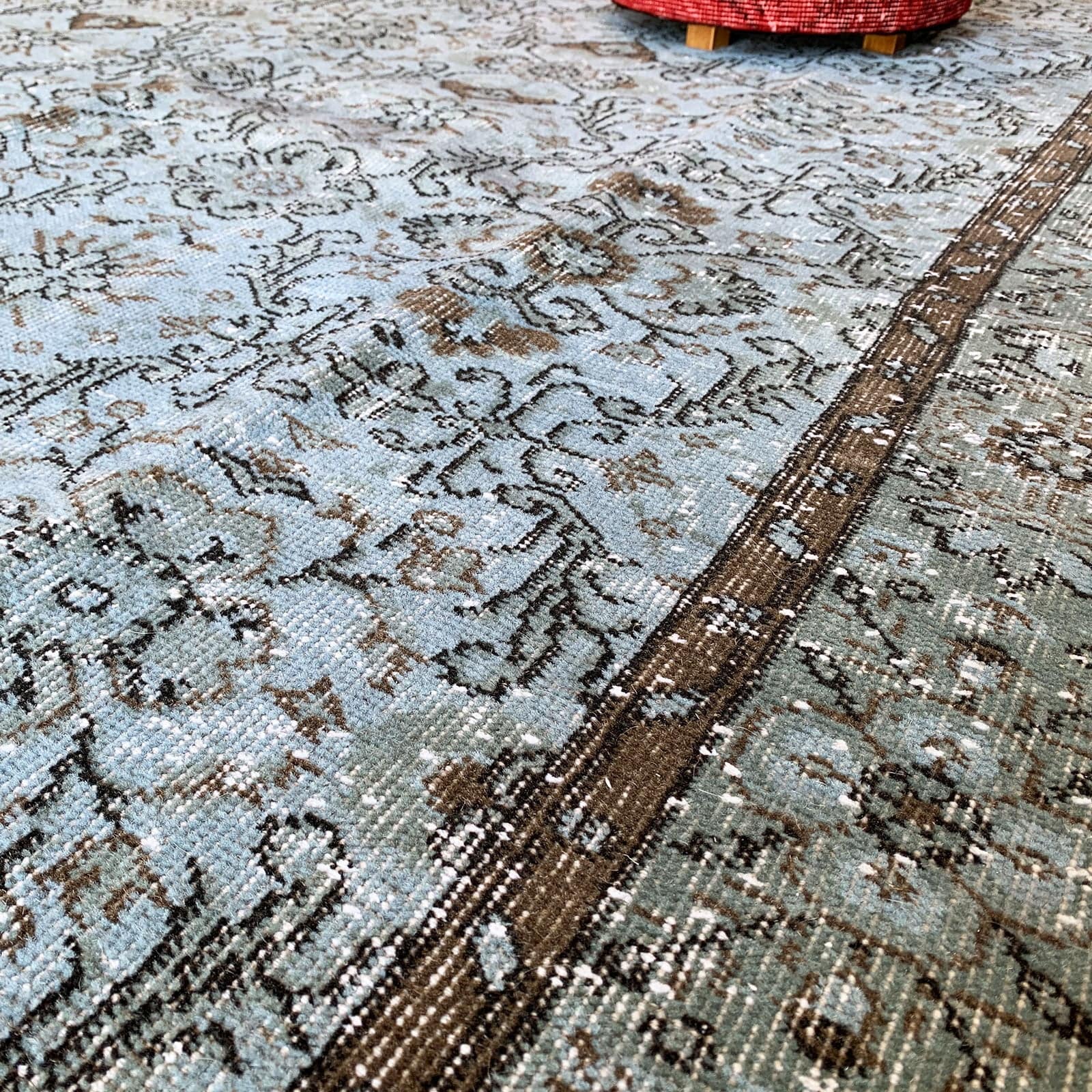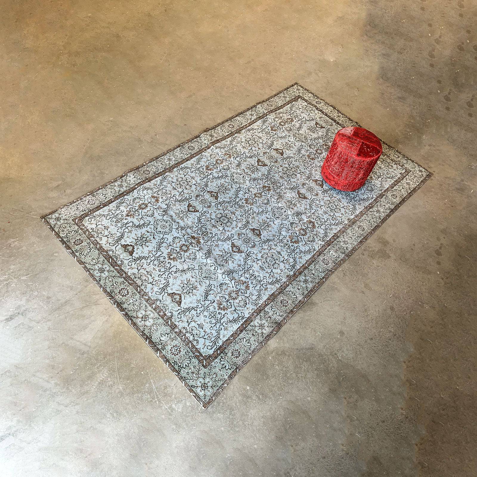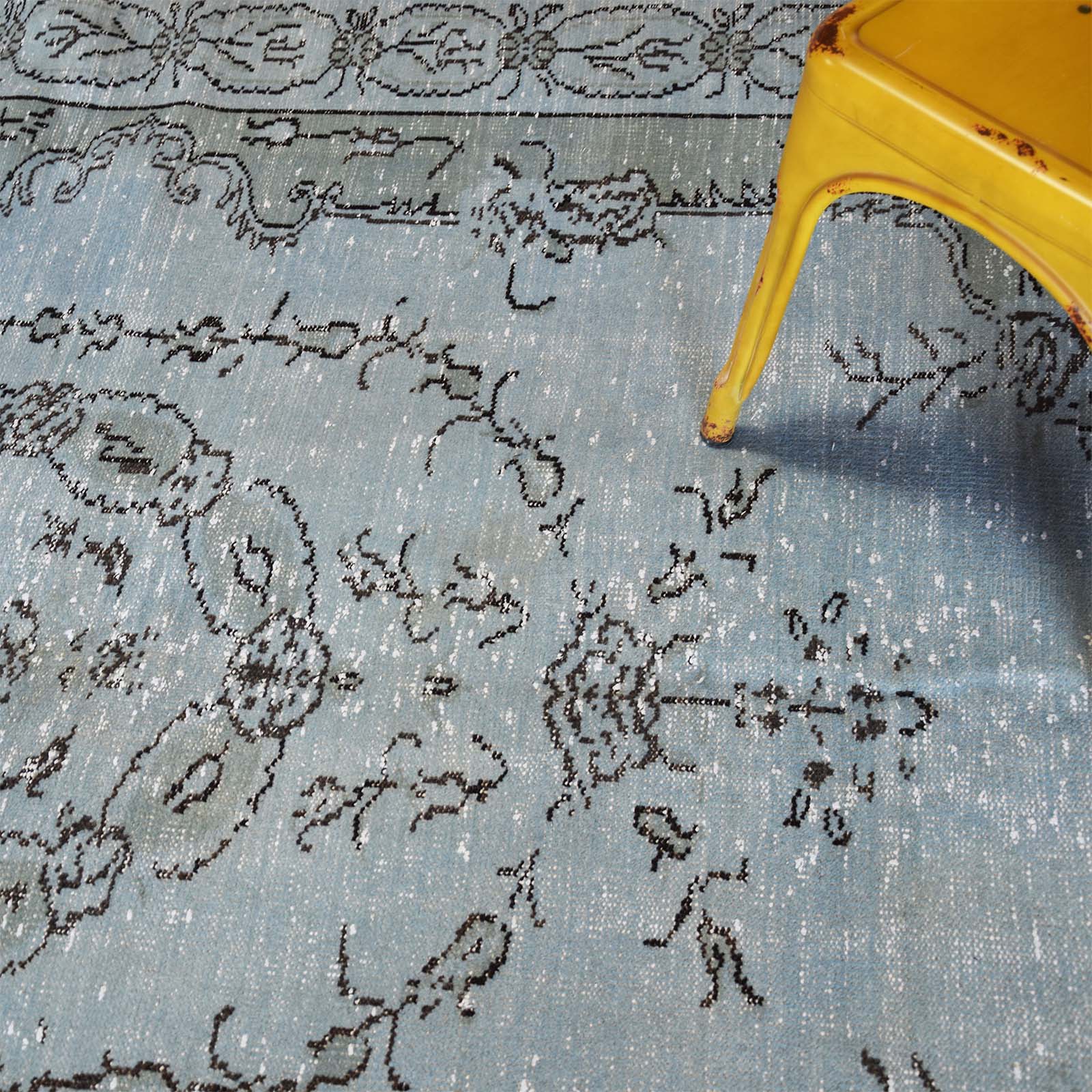 This over-dyed Turkish vintage rug is a celebration of both past and present. Created using a technique employed to breathe new life into older hand-knotted rugs, the colors are first neutralized before the rug is over-dyed with its entirely new hue. The original pattern can still be traced, a tribute to the skilled weavers who created it. The quality of the rug shines through, yet the recycled rug now fits perfectly into a contemporary interior design. Consider it not just as a rug, but as a unique piece of contemporary art.