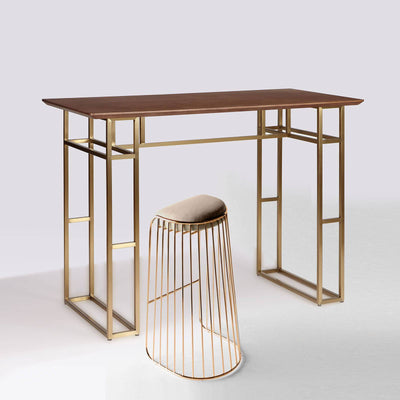 Discover a captivating blend of form and function in our Agen Bar Table. Its strong Golden Electroplated Stainless steel legs beautifully support an elegant, natural ash veneer top surface - making it the perfect piece to provide both style and functionality to any space.
