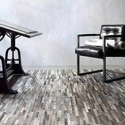 Modern elegance meets rustic charm with this beautiful cowhide area rug. The rug is crafted from strips of genuine hair-on cowhide leather, the hand-stitched pieces ranging in colors from grey to natural tones. A felt back protects the rug from scratching your floors, and provides a bit of cushioning for extra comfort.