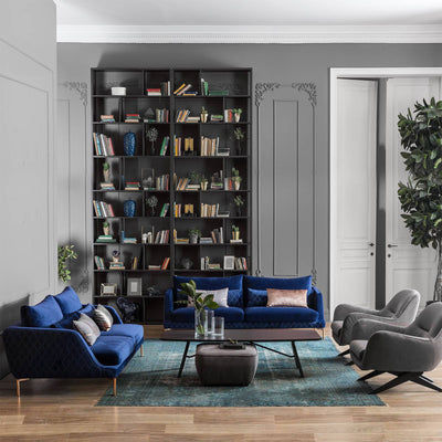 Sofa DARK BLUE Upholstery and Rose gold legs |