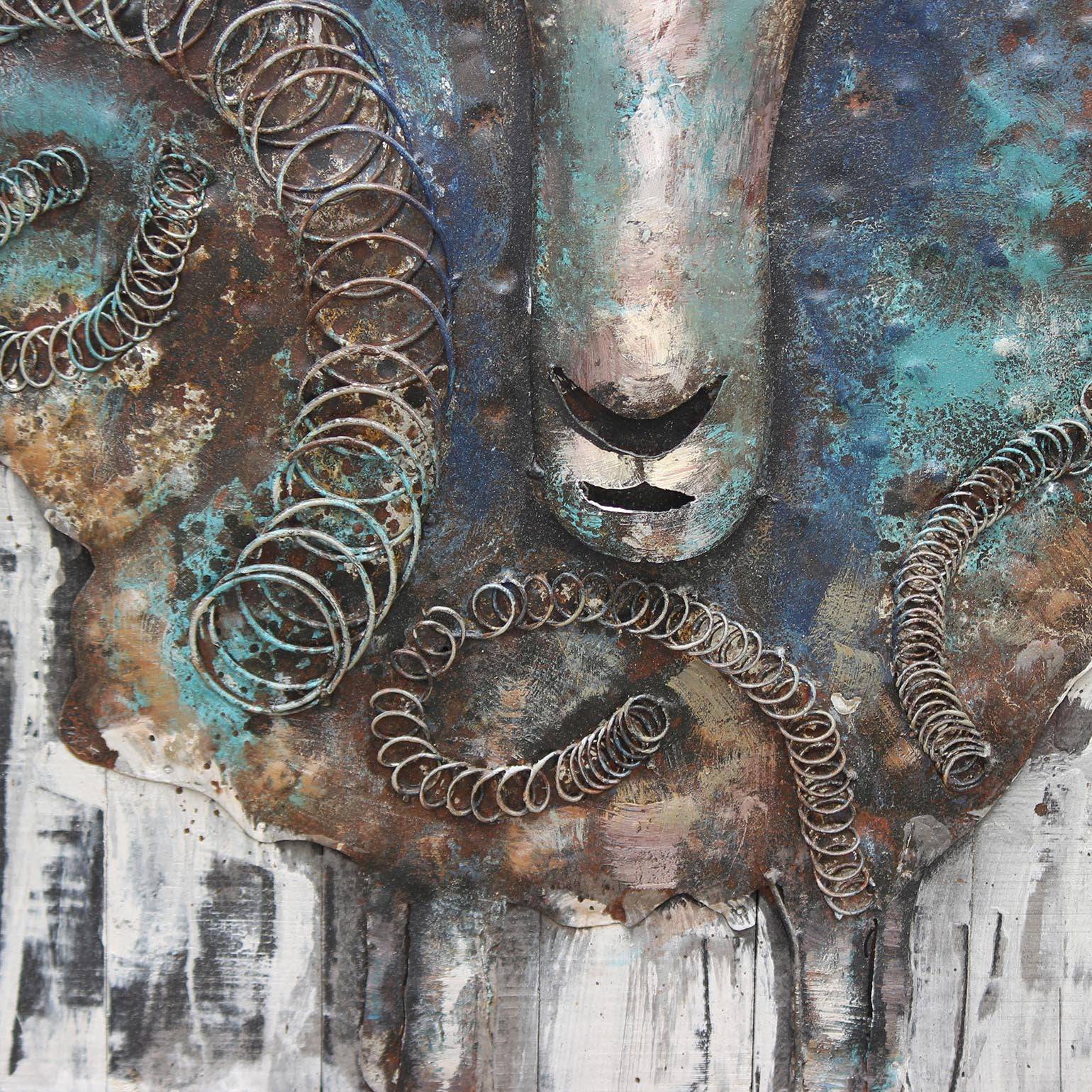 This is an exquisite museum-quality handmade metal painting - created by our experienced artist and completed to perfection. Metal pieces are hand-cut into small different shapes by the artist then welded to Metal art frame to give. Once it is welded they are hand-painted by acrylic.