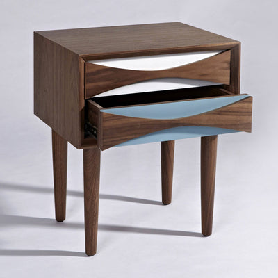 Add a bold, new look to your home with this architectural accent table. The blue painted drawer contrasts against the dusty oak finish for a youthful take on midcentury modern design. A low profile and practical double drawer make this table a perfect fit for smaller spaces. Pair with a tall vase or under a long mirror for a decorative entryway, place in the living room as an end table, or even use it as a printer stand in your home office!