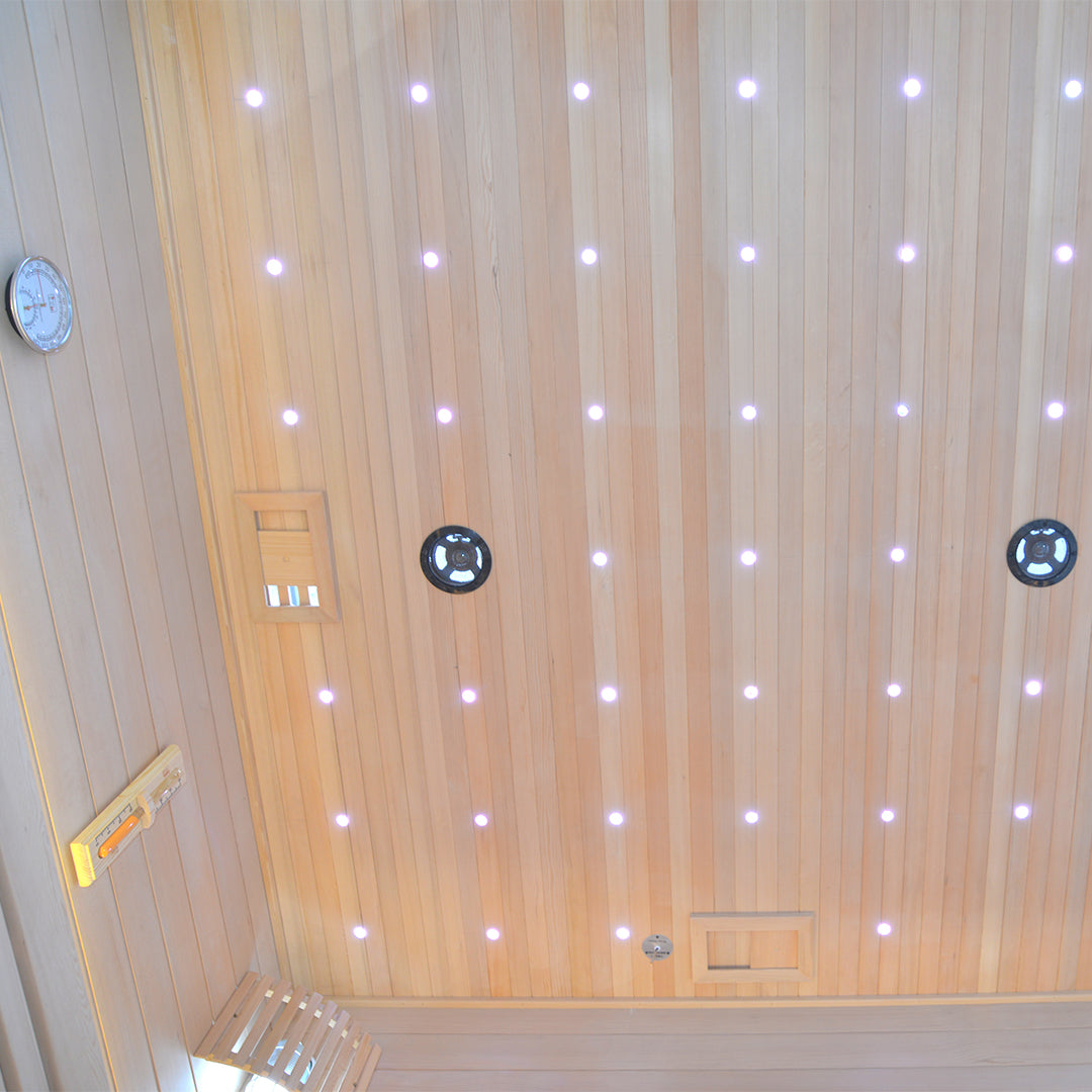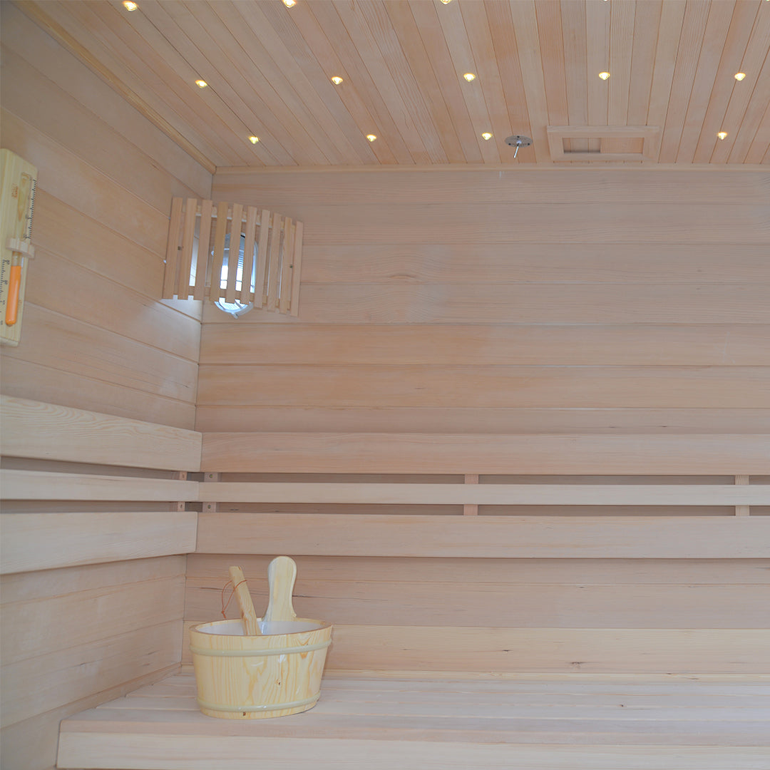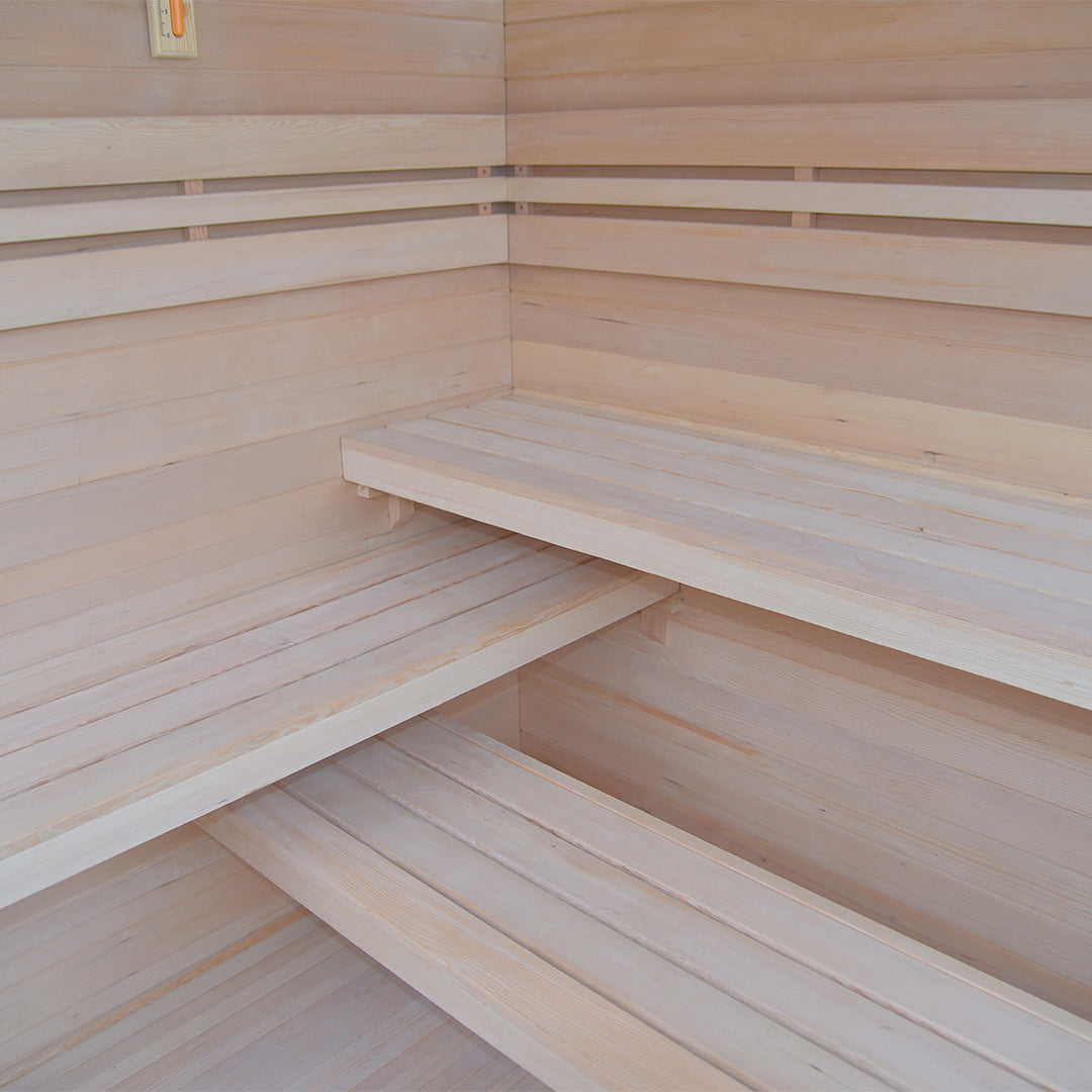 Power: 9KW Harvia stove , three phase 380v, no plug LCD Bluetooth control panel. Two layers benches+L shape floating bench. Keep one side wall with full glass and use transparent glasses.black door hinges. Keep wooden panel side width 10cm |