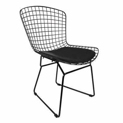 This classic mid-20th century modern replica chair is a brilliant design. the stool is exceptionally strong and surprisingly comfortable with its unique bent and welded steel rod construction. Black Wire Side Chair makes a clean, simple addition to a dining room or outside patio area. Constructed from Black-coated steel, this chair features a black seat. Slip-resistant rubber pads on the bottom prevent scratching and sliding on surfaces.