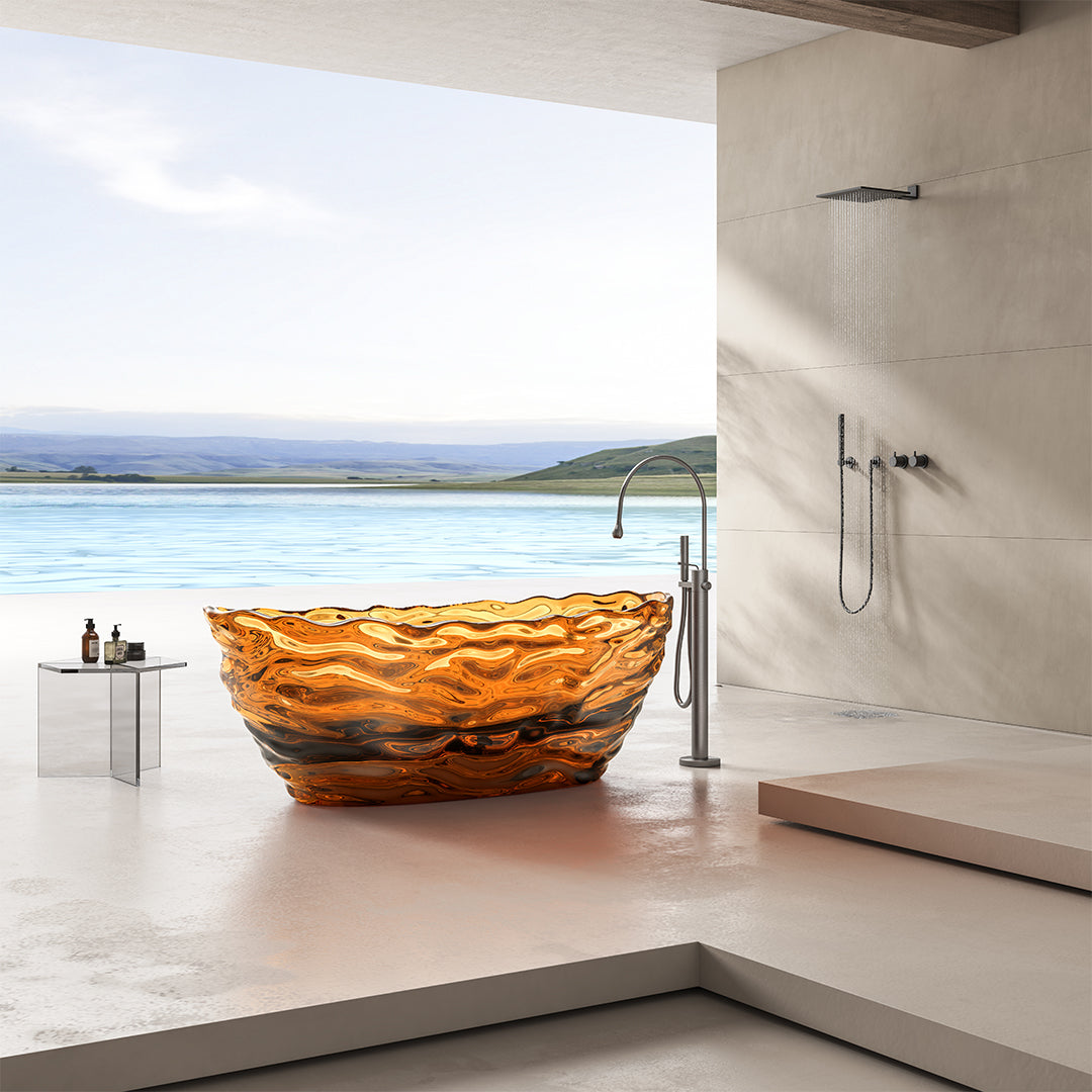 The Elysium Bathtub with Faucet in vibrant orange resin combines modern design with durable craftsmanship. Crafted from high-quality resin, it offers a smooth, glossy finish that resists stains and ensures long-lasting beauty. The integrated faucet provides convenient water control, enhancing your bathing experience. Ideal for those seeking a stylish and functional centerpiece, this bathtub adds both comfort and a bold aesthetic to any bathroom setting.