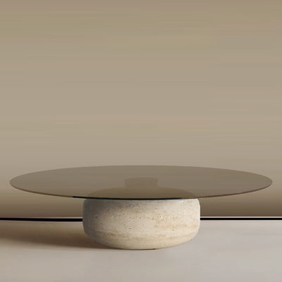 Minimal Grey Glass & Travatine Marble Round Coffee Table CT8683-SG-NEW